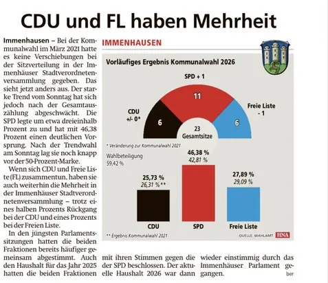 Die aktuelle Schlagzeile der HNA „CDU und Freie Liste Immenhausen haben Mehrheit“ erweckt den Eindruck eines stabilen politischen Bündnisses, das in Wirklichkeit nicht besteht. Wir möchten die Situation für unsere Wählerinnen und Wähler sowie alle Bürgerinnen und Bürger von Immenhausen klar und verständlich darstellen.